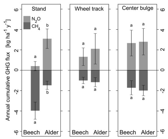 In Table 3, GHG emissions in CO2 equivalents are shown, based on the assumption that 14% of a stand’s area is occupied by skid trails [] and that wheel track and center bulge make up 50% of a skid trail, respectively. Significant differences in N2O and CH4 fluxes between beech and alder are only present in the undisturbed stands. For CO2, higher emissions are found in all strata under alder.