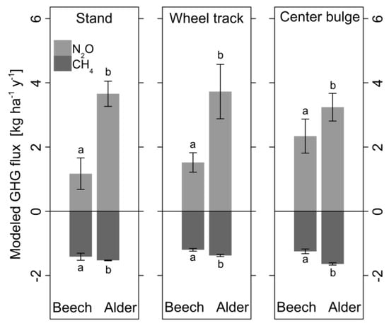Modeled CH4 and N2O fluxes at standardized soil temperature (10 °C) and Ds/D0 (0.05). Bars represent medians of the values predicted by the respective linear mixed effects models with their 95% confidence interval. Different letters indicate significant differences between beech and alder within strata.
