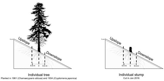 This study was conducted in two adjacent coniferous plantations of Chamaecyparis obtusa (Siebold et Zucc.) Endl. and Cryptomeria japonica (L.f.) D. Don in the northern part of Kyushu, Japan (33°38′N, 130°31′E). Ch. obtusa and Cr. japonica occupy 25% and 44%, respectively, of plantations in Japan []. Ch. obtusa and Cr. japonica were planted in 1961 (5.2 ha) and 1934 (0.5 ha), respectively. Parts of these plantations were logged from December 2015 to February 2016, at which time clear-cutting (Ch. obtusa) and thinning (Cr. japonica) were conducted (1.14 ha). The current study was conducted in 2017, one year after logging. The soil type is classified as brown forest soil originating from serpentine bedrock []. The mean annual air temperature and precipitation (2007–2016) of the meteorological station located 15 km southwest of the study site were 17 °C and 1700 mm, respectively (Hakata Meteorological Station, 33°36′N, 130°25′E, ca. 3 m above sea level (a.s.l.)). Both plantations have a density of 1600 trees ha−1. In total, four study plots were chosen: (1) Ch. obtusa intact tree plot; (2) Cr. japonica intact tree plot; (3) Ch. obtusa cut tree plot; and (4) Cr. japonica cut tree plot. The intact and cut tree plots were selected to possess the same site characteristics (slope 30°, southwest facing, and 130 m a.s.l; see []). In each plot, we selected five individual trees or stumps for collection of soil samples. Soil samples at 0–5 cm depth were taken at a distance of 0.5 m upslope and downslope from each individual tree/stump (Figure 1). Thus, there were five replicates for each individual position either upslope or downslope of individual trees or stumps. A total of 10 replicates (5 upslope and 5 downslope) were collected in each plot. We also collected soil samples from 5–10 and 10–30 cm depths to evaluate SWR at different depths. The average distance from other individual trees or stumps in the upslope and downslope areas of selected trees and stumps was ~4 m in Ch. obtusa plots and ~3 m in Cr. japonica plots. Two sets of soil samples were collected to measure SWR intensity and soil properties. Soil texture was determined by the hydrometer method. Intact soil samples were collected with a steel cylinder (100 cm3) for determination of soil bulk density and soil porosity. Soil organic matter (SOM) was measured using the loss on ignition method. Soil gravimetric water content (θg) and aggregate mean weight diameter (MWD) were also measured, as described below. The soil samples were transferred into the laboratory within 24 h and were air-dried at room temperature (20 °C) for about 1 week (Table 1; for further details on the study site, see []).