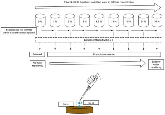 In this study, the molarity of an ethanol droplet (MED) test was used for evaluating SWR intensity (%) []. The MED test measures the potential SWR intensity of the soil surface by dropping various ethanol dilutions on the soil surface and observing their infiltration performance. Pure ethanol has a lower surface tension (22.7 mN m−1 at 20 °C) than water (72.8 mN m−1 at 20 °C). Dilution of pure ethanol with water at different percentages provides different surface tension values. The surface tension of a droplet on the soil surface decreases with increasing ethanol percentage, and vice versa. In our experiment, the pure ethanol was diluted with distilled water into separate solutions containing different percentages of ethanol on a volume basis (0%, 1.0%, 3.0%, 5.0%, 8.5%, 13.0%, 18.0%, 24.0% and 36.0%, v v−1) []. The SWR intensity was tested in soil samples by dropping these solutions onto surfaces of smoothed soil samples in Petri dishes using a micropipette (droplet size: 50.0 µL) from 5.0 mm height in increasing order of concentration, from 0% to 36%. When a droplet of specific solution infiltrated the soil within 3 s, the solution before that was selected as the potential SWR intensity (except 0%). For example, if the 8.5% droplet infiltrated within 3 s, the 5.0% solution was selected as the solution defining the SWR intensity of that soil sample (Figure 2). In this study, we present the ethanol % in the results to show the SWR intensity of soil samples (with increasing ethanol %, SWR intensity also increases).
