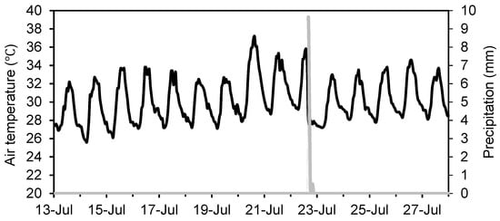 Precipitation (mm) and air temperature (°C) records at Hakata Meteorological Station between 13 July 2018 and 27 July 2018. Black and gray lines represent air temperature and precipitation, respectively.