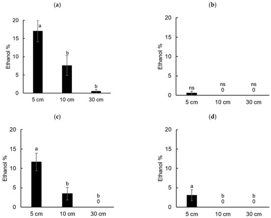 Soil water repellency (SWR) intensity at different soil depths in Ch. obtusa intact tree (a), Cr. japonica intact tree (b), Ch. obtusa cut tree (c) and Cr. japonica cut tree (d) plots. Small letters and ns denote significant and non-significant differences, respectively, between different soil depths.