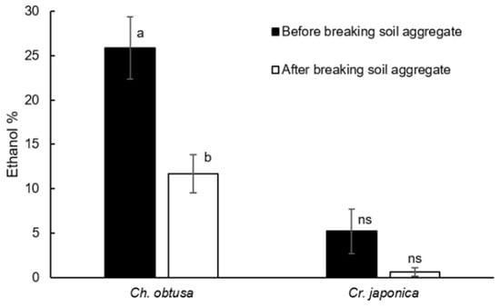Soil water repellency (SWR) intensity of broken soil aggregates at 5 cm soil depth of Ch. obtusa and Cr. japonica intact tree plots. Small letters and ns denote significant and non-significant differences, respectively.