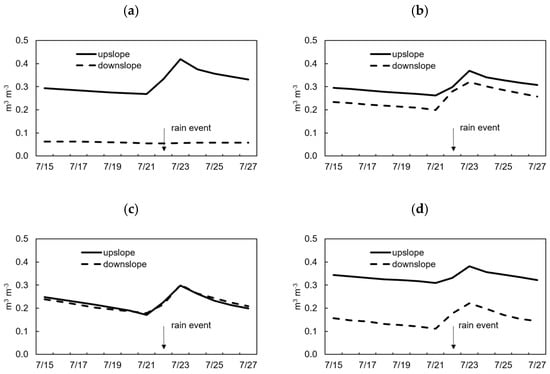 Soil moisture content (m3 m−3) at 5 cm soil depth upslope and downslope of individual Ch. obtusa trees (a), individual Cr. japonica trees (b), individual Ch. obtusa stumps (c) and individual Cr. japonica stumps (d). Down arrows indicate the rain event on 22 July.