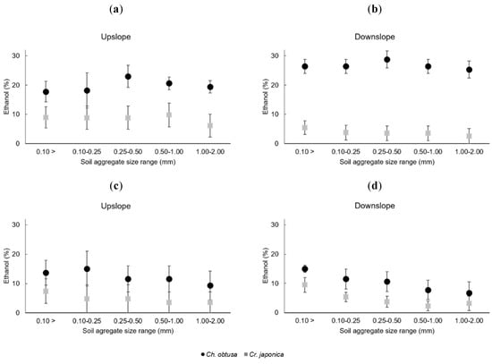 The soil aggregate size measurements showed that the different soil particle sizes had non-significant effects on SWR intensity regardless of tree species and whether the trees in the plots were intact or had been cut (Figure 8). Soil aggregates showed higher SWR intensity in the Ch. obtusa plots than in the Cr. japonica plots (Figure 8a,b). The SWR intensity among all different soil particle sizes was also higher in the Ch. obtusa intact tree plot than in the Ch. obtusa cut tree plot (Figure 8). Soil aggregates downslope of individual Ch. obtusa trees had higher SWR intensity than those from upslope areas (Figure 8a,b). The SWR intensity among different sizes of soil aggregates was equal between upslope and downslope of individual Ch. obtusa stumps (Figure 8c,d).
