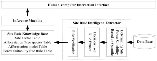 To solve the problems of incomplete expert knowledge and difficult acquisition, this paper proposed to determine forest site suitability by quantile regression, then constructed a decision tree of the ID3, C5.0 and CART algorithms, and finally selected the best performing CART algorithm to construct the model. This system constructed the extractor of afforestation rules based on site quality evaluation of the potential productivity method, the knowledge discovery method and the decision tree theory of the machine learning method, taking the Chinese fir and Masson Pine tree species in Jinping County of Guizhou Province as examples. After validating the stand rules of Chinese fir and Masson pine, the production representation method was used to construct the relationship model of the knowledge base. In conclusion, the following are the highlights of the paper: