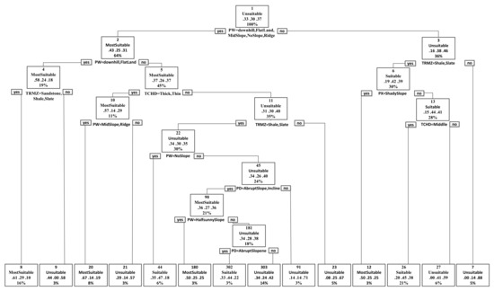 Based on the decision tree model of the CART algorithm, the decision trees for the classification of tree suitability of Chinese fir and Masson pine were established, as shown in Figure 4 and Figure 5. Figure 4 shows that the decision tree established for Chinese fir had 10 layers after pruning, and 23 leaf nodes were generated, among which 6 were most suitable and 10 were suitable. Table 9 shows the importance of each input site factor of the corresponding decision tree. The slope position, soil parent material, soil layer thickness, elevation and landform were important factors affecting the growth of Chinese fir in the Jinping area of Guizhou Province, corresponding to the main classification factors in the decision tree. For the first layer of the soil parent material factor, (shale) was better for tree suitability. For the second layer of the slope position factor, (whole slope) was more suitable. For the third layer of soil thickness factor, (thickness) was more suitable and (low elevation was selected for tree suitability. In the region concerned, the three factors of slope, soil type and slope direction had little influence on tree suitability.