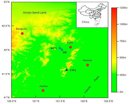 Locations of the study area (green rectangle), tree-ring sampling sites (blue tree, WFY and SH; black tree for comparison, YWL) and Fuxin meteorological station (red dot).