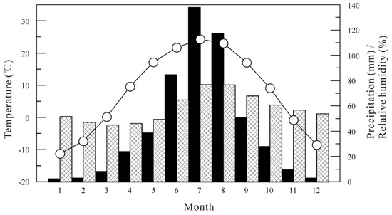 Distribution of monthly mean temperature (circles), precipitation (black bars) and relative humidity (crosshatched bars) from Fuxin meteorological station data during the period of 1950–2012.