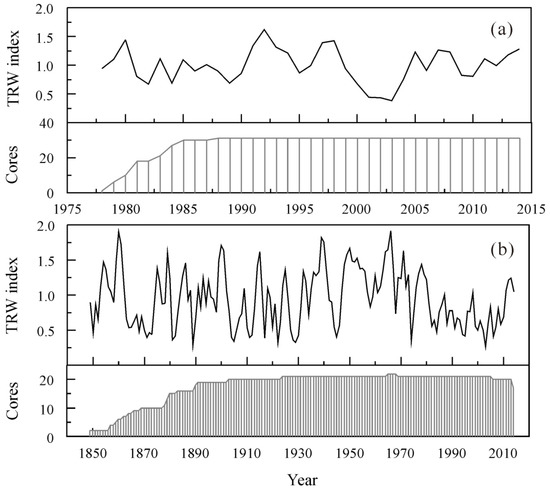 The periods of the SH and WFY chronologies were 1978–2014 and 1849–2014 CE, respectively (Figure 3). However, based on the threshold of EPS greater than 0.85, the high-confidence beginning years were 1979 and 1859 with the minimum sample depth in five cores for SH and WFY, respectively (Table 1). The common signal strength among the tree-ring series and the reliability of the chronologies were assessed by mean sensitivity (MS), mean correlation between all series (MCS), and signal-to-noise ratio (SNR) [22]. Compared to SH, the WFY chronology showed a stronger signal with higher MS (0.321), MCS (0.660) and first order autocorrelation (0.656) (Table 1). The relatively lower value of SNR (12.804) in the WFY chronology could be attributed to the difference in length of both chronologies, that is, the WFY span was longer than the SH chronology. Even so, the first vector variances of the two chronologies were very close, that is, 53.1% (SH) and 53% (WFY). Overall, the statistical features of both SH and WFY tree-ring standard chronologies given by the ARSTAN program (Table 1) suggested the capability of radial growth-based climate analysis.