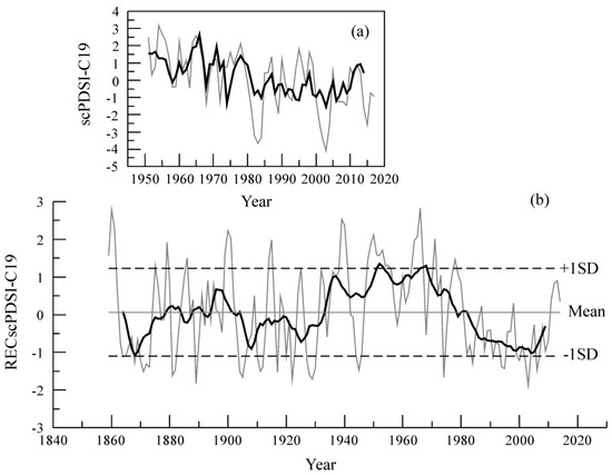 Cycle analyses demonstrated (Figure 6) that RECscPDSI-C19 had significant multitaper spectrum (MTM) peaks at 8.0–8.61 a (p < 0.01), 7.37–7.94 a (p < 0.01), 6.87–6.96 a (p < 0.05), 5.60–5.69 a (p < 0.05), 4.92–4.95 a (p < 0.05), 3.39–3.94 a (p < 0.1) and 2.25–2.35 a (p < 0.1). Similar periods were found in the wavelet results (Figure 6).