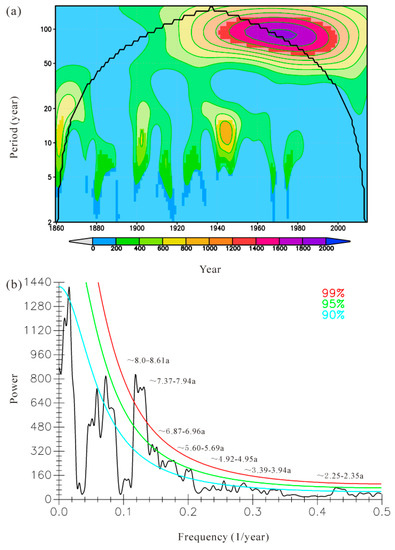 Cycle results of (a) Paul wavelet with a parameter value of 4 [29] and (b) multitaper spectrum (MTM) analyses [28] for reconstructed January–September mean self-calibrating Palmer Drought Severity Index for the period of 1859–2014. The cone of influence in the wavelet analysis is indicated by the black line. The confidence intervals at 99%, 95%, and 90% for peaks in the power spectrum are indicated by the red, green, and blue lines, respectively.