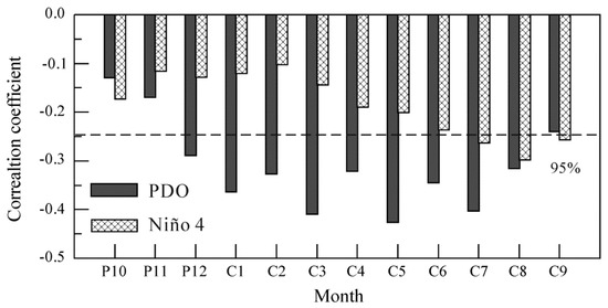 Correlations between reconstructed January–September mean self-calibrating Palmer Drought Severity Index and the PDO [47] and el Niño 4 indices [27] in the period of 1950–2013. P indicates the previous year, C indicates the current year. The dashed line indicates the confidence level of 95%.