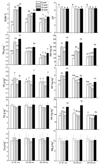 All statistical analyses were conducted using the Software Statistical Package for Windows (SPSS 17.0, Chicago, IL, USA). Two-way ANOVA was used to check the influence of stand age, soil depth, and their interaction on soil parameters. Moreover, one-way analysis of variance (ANOVA) followed by a post hoc least significant differences (LSD) test was applied to determine the effect of stand age or soil depth on soil parameters (pH, SOM, TN, AN, TP, AP, TK, AK, Ca, and Mg). Before performing ANOVA, data normality and the homogeneity of variances were tested. Statistically significant differences were designated at p < 0.05.