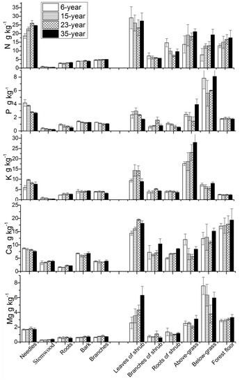 Among the different tree components, nutrient concentrations were highest in needles; intermediate in branches, roots, and bark; and lowest in stemwood (Figure 2). Nutrient concentrations in needles, roots, and branches followed the order of N > K > Ca > P > Mg, while concentrations in stemwood and bark ranked as Ca > N > K > P > Mg. All nutrient concentrations in stemwood decreased with stand age, except for Ca and Mg, which increased. P and Ca concentrations in needles declined with age. In the understory, nutrient concentrations were highest in the shrub leaves and above-grass, intermediate in shrub roots and below-grass, and lowest in the shrub branches (Figure 2). All nutrient concentrations were higher in understory components than in all tree components (except needles). The N concentration was similar between shrub leaves (24.3–29.1 g kg−1) and larch needles (18.5–24.6 g kg−1). P and Mg were highest in below-grass, with~2 or 3-fold higher concentrations than in larch needles. K concentrations were 17.6–27.9 g kg−1 in above-grass—the highest among all components and 3-fold more than that in larch needles. Ca concentrations reached 14.4–19.5 g kg−1 in shrub leaves, approximately twice that in larch needles. In the forest floor, N, Ca, and Mg concentrations increased with stand age, whereas K and P concentrations decreased. The forest floor had the highest Ca concentration at 17.0–19.4 g kg−1, medium-high N concentrations, and low concentrations of Mg, P, and especially K.