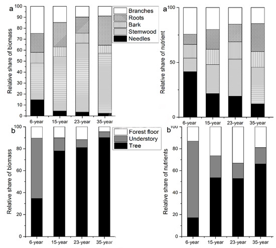 Partitioning of tree components (a) and the tree, understory, and forest floor (b) biomass and nutrients in four ages of larch plantations.
