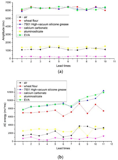 Amplitude and energy of acoustic emission signals with six different materials as couplant.