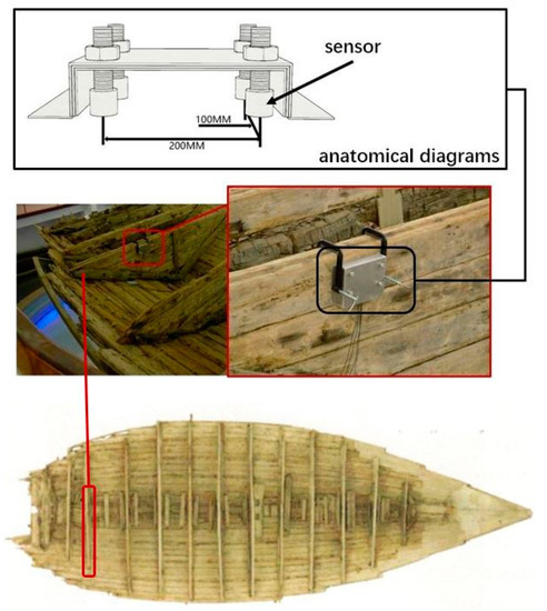 Acoustic emission detection system of the Song Dynasty shipwreck in the Quanzhou bay monitors one location that is on the partition (Figure 5). The partition materials are chiefly Chinese fir that have no obvious damage. Since the wooden ship is placed in a public environment, we did a test about whether visitors would affect the signal collection before the formal monitoring of the shipwreck. The results show that visitors will increase the background noise in the signal collection process, which does not affect the collection of acoustic emission signals. Therefore, the influence of visitors on the signal can be ignored.