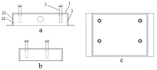 Schematic diagram of a three-dimensional structure of a sound insulation cabin: Front view (a), side view (b) and top view (c), where 21 and 22 represent a sound insulation and 3 is used to fix the acoustic emission (AE) sensors.
