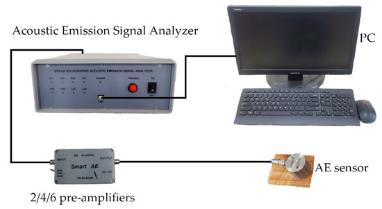 An acoustic emission signal analyzer 8-channel system (from Beijing Softland Times Scientific & Technology Co. Ltd., China) was used to gather the AE signals (see Figure 7). The AE signals were measured with a SR-150 piezoelectric sensor in the [50–400 kHz] frequency range. The acoustic signals were amplified with a gain of 90 dB. The acoustic signals were acquired with a sampling rate of 3 MHz by means of Acoustic Emission Analyzer. A total of 45 mv was selected as the threshold voltage to trigger permanent storage of the AE signals [42].