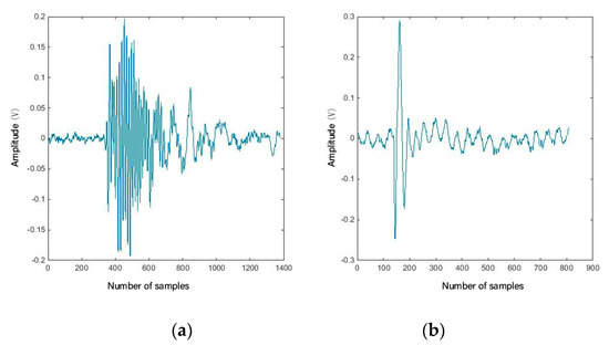 After monitoring throughout the year, AE tracing system collected a total of 73 AE events. The time domain diagram of two typical signals is shown in Figure 9.