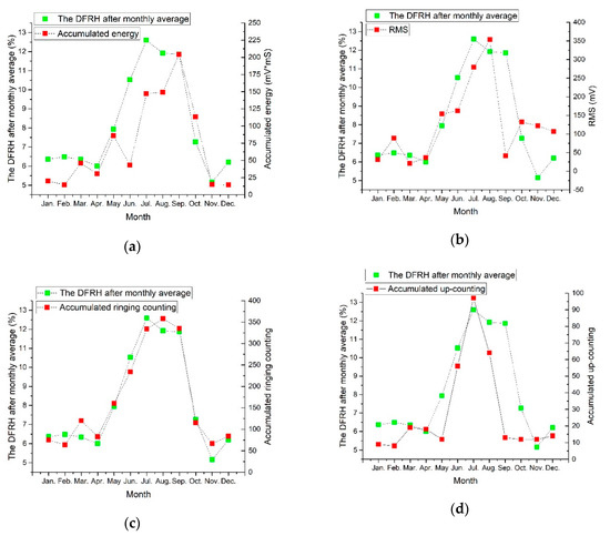 Based on Figure 8, accumulated energy (Figure 10a), RMS value (Root Mean Square Voltage, Figure 10b), and accumulated up-counting (Figure 10d) are significantly correlated with DFRH after monthly average. Further, accumulated ringing counting (Figure 10c) is strongly correlated with DFRH after monthly average. In order to quantify this relationship, correlation coefficients between AE parameters and DFRH after monthly average were calculated, as shown in Table 1.