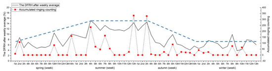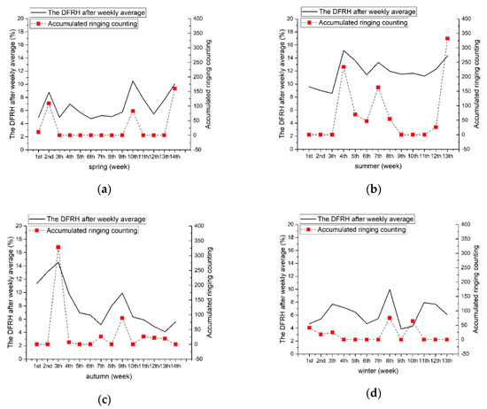 Relationship between DFRH after weekly average and the accumulated ringing counting in spring, summer, autumn, and winter.
