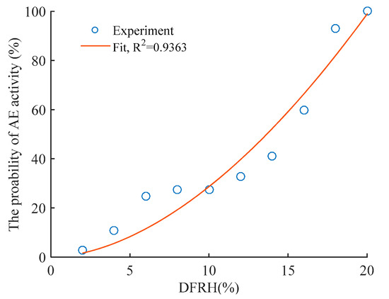 The moisture content of wood is an important factor, and it fluctuates with RH. For wooden cultural objects, the moisture content is more susceptible to RH. As the DFRH increases (indicating in the fluctuation of RH), the degree of shrinkage and swelling of the wooden ship increases. This means that the wooden structures are in an unstable state, and the probability of AE activity increases. As shown in Figure 14, with increasing DFRH range, the probability of AE activity increases and approximately presents exponential growth. According to the relationship between DFRH and the probability of AE activity, there is a clear exponential relationship. The relationship between the probability of AE activity and DFRH is obtained by fitting: