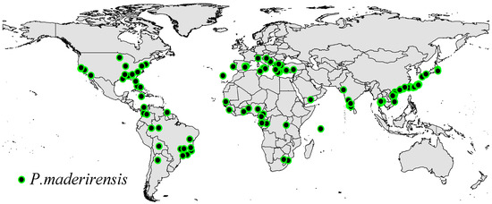 Georeferenced occurrence data of P. madeirensis Green were compiled from the following sources: the Global Biodiversity Information Facility (GBIF, https://www.gbif.org/), the Center of Agriculture and Bioscience International (CABI, https://www.cabi.org), the European and Mediterranean Plant Protection Organization (EPPO, https://www.eppo.int), Scalenet (http://scalenet.info), and other existing literature, as listed in Table S1. Geocoordinates for each distribution site were referenced from the data in the literature or by using Google Maps. Potential errors in the distribution information and duplicate occurrences were excluded. For example, data indicating the locations of province or state were removed, but data referring to the county, city, and town were retained. An initial dataset containing 124 georeferenced occurrences was compiled, of which 15 were in the Madeira mealybug’s native range and 109 records were from its invasive range.