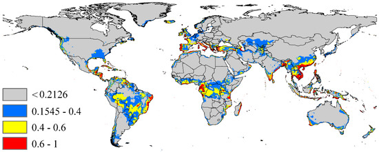 The MaxEnt predictions of gains in suitable habitat areas under the future climate scenario/year combination RCP 8.5-2070 also showed a decrease near 11.21 × 106 km2 (a 13.43% reduction in the currently suitable habitat areas) (Figure 4D and Table 2). The highly suitable area might reduce by 30.40% under this scenario, constricting the area to 1.19 × 106 km2. The restricted range was predicted to increase the highly suitable areas in Southern China and Eastern Europe, but the model predicted a constriction of suitable habit areas in some regions, such as countries around the Mediterranean Sea, South America, Africa.