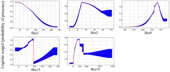 Response cures showing the relationships between the probability of presence of pest and five bioclimatic variables. Values shown are the average over 10 replicate runs; blue margins show ± SD calculated over 10 replicates.