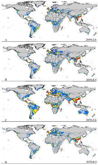 The predicted area gains in the area of suitable habitat were predicted to be about 11.86 × 106 km2, which was 8.41% lower than the current conditions when compared to condition RCP 2.6-2050 (Figure 4A and Table 2). The highly suitable area was reduced to 1.21 × 106 km2 under these climate scenarios, of which there was a 29.23% decrease over the current highly suitable areas. The highly suitable areas were markedly reduced in Southern China, Central Africa and northeastern India. Under RCP 8.5-2050, both the suitable habit and highly suitable habit decreased relative to present-day conditions. The areas were reduced by 12.04% and 29.82% for suitable habitats and highly suitable habitats, respectively (Figure 4B and Table 2).