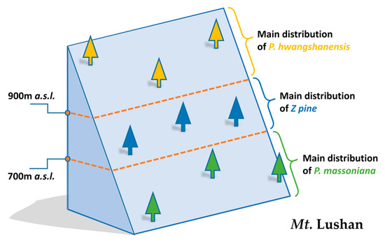 Schematic indicating the main distribution areas of P. massoniana, P.hwangshanensis, and their introgression hybrid, the Z pine, on Mt. Lushan, Jiangxi Province, China. a.s.l.: above sea level.