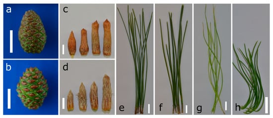 Representative images of tissue samples collected. (a) P. massoniana cone (MCN); (b) Z pine cone (ZCN); (c) young stem of P. massoniana (MYS); (d) young stem of Z pine (ZYS); (e) mature needle of P. massoniana (MMN); (f) mature needle of Z pine (ZMN); (g) young needle of P. massoniana (MYN); (h) young needle of Z pine (ZYN). Scale = 10 mm.