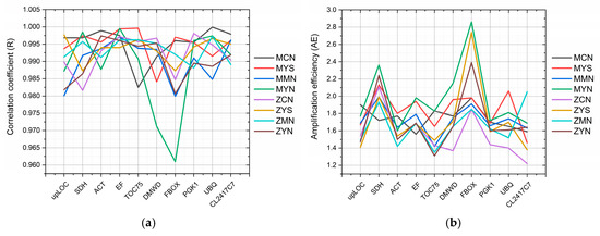 Correlation coefficient and amplification efficiency of ten candidate reference genes across all samples. (a) Correlation coefficient; (b) amplification efficiency. The legend on the right displays colored sample code information, see Table 1.