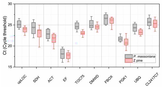During a qRT-PCR reaction, fluorescence values are recorded during every cycle and represent the amount of product amplified up until that point in the amplification reaction [9]. If the sample contains more DNA template, it would take less cycles to reach the point at which the fluorescence signal could be detected [34]. This point is called the cycle threshold [9]. The cycle threshold, or Ct, is the main parameter obtained from a qRT-PCR reaction. Lower Ct values equate to a higher gene abundance. We found that the Z pine shows overall lower Ct values for all tested genes, in other words, it shows higher expression of these genes compared to P. massoniana. It is currently not clear why this is the case, however, since significant expression level differences exist between these two taxa, it is advised to perform stability expression analysis separately for each species if possible.
