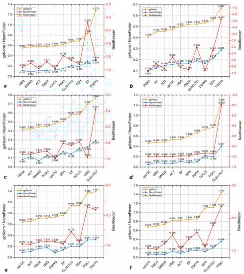 We used three different algorithms to evaluate the expression stability of candidate reference genes: geNorm [20], NormFidner [21], and BestKeeper [22]. From each algorithm, we used both the stability value and the ranking score of each gene to determine their suitability as reference gene across multiple tissue types. The three algorithms did not always give the same ranking of gene expression stability (Figure 5a–g). In particular, geNorm and NormFinder showed a similar ranking across most samples, while BestKeeper gave a significantly different outcome. The reason for this phenomenon could be that geNorm and NormFinder requires a ΔCt input while BestKeeper uses the raw Ct data. This difference in reference gene evaluation could also be seen in Undaria pinnatifida [35]. However, studies have also been reported in which NormFinder and BestKeeper provided similar outcomes [36]. Multiple control reference genes are essential if possible [10]. Therefore, the parameter of pairwise variation in geNorm was calculated (Figure 5h) as a reference.