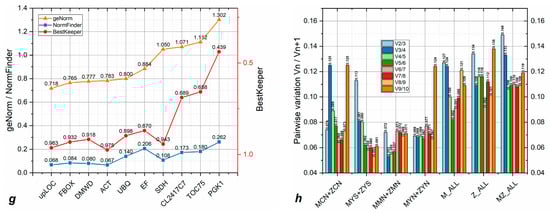We next analyzed the optimal number of reference genes that should be used for relative expression normalization using geNorm (Figure 5h). According to the criteria mentioned in Section 2.4, all pairwise variations of all tissue types expressed below 0.15 (threshold of default), therefore a combination of two genes would be the optimal number for every normalization.