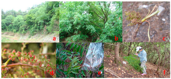 Pistacia chinensis B. (a) P. chinensis population, (b) P. chinensis tree, (c) male flowers, (d) female flowers, (e) seeds, and (f) the collection of fresh intact leaves.