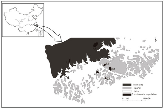 Map indicating the locations of the six Pistacia chinensis populations. Large island habitats B1 and B2; and small island habitats C1 and C2.