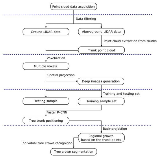 In this paper, a novel individual tree segmentation method combined with the deep learning method of Faster R-CNN is proposed. The research objectives of this paper mainly include (1) data collection for three rubber tree forest plots of different clones using ground-based mobile LiDAR; (2) application of a voxelisation method and projection strategy to transform the 3D scanned points of the trunks of the rubber trees to deep images (namely, the images generated by the projection strategy for Faster R-CNN of deep learning); (3) location of rubber tree trunks on many deep images generated from voxelisation of scanned points of many rubber trees by training and testing the Faster R-CNN; and (4) segmentation of individual trees based on detected scanned trunk points and the region growing algorithm. Our approach uses the concept of deep learning, which provides a strong identification ability through large training sample analysis to automatically recognize the trunk information without being affected by a tilted tree trunk or wild-grown twigs or leaves. The workflow of our method is shown in Figure 1.
