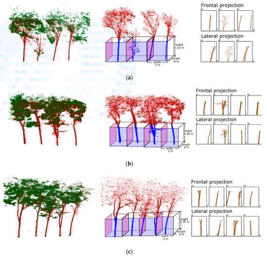 Data pre-processing and multi-angle projecting results for the three rubber forest plots: (a) clone PR107, (b) CATAS 7-20-59 and (c) CATAS 8-7-9. Left: Wood-leaf classification results of scanned data of the typical trees belonging to the three forest plots, where the classified leaf points shown in green and the classified wood points shown in crimson. Middle: Voxelisation of the typical trees from three forest plots, where the length and width of the voxel are set according to the actual plant spacing and the height of the voxel is set according to the crown base height of the three rubber tree clones. Right: Deep images generated using frontal and lateral projection from the scanned points of lower part of the trees in three forest plots.