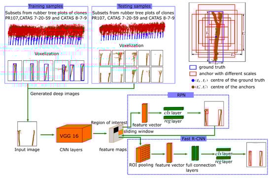 The flow chart of the Faster R-CNN (faster region-based convolutional neural network) used to detect the rubber tree trunk in deep images. The deep images for the training samples generated from the subsets of three rubber tree plots were fed into the Faster R-CNN to classify and regress the anchor (bounding box) of the trunk in deep images. The deep images of the testing samples generated from other subsets of three rubber tree plots were tested to obtain the anchor of the trunk by the trained Faster R-CNN.