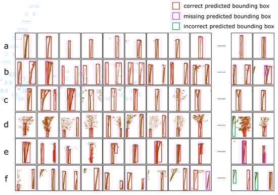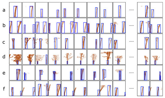 Certain factors may lead to the detection errors in the above three cases (b, d and e). First, as shown in Table 4, there are relatively few deep images used to train the three cases (b, d and e), which may lead to under-fitting problems (i.e., deficiently irrelevant deep images were used for training, resulting in low testing result accuracy). In addition, for case e, multiple trunks may have a high degree of overlap after projection, which may cause serious interference with trunk detection. For case f, the crooked rubber tree trunks caused by long-term hurricane disturbances may have been voxelised into two voxels. When marking the corresponding training samples, only the lower part of these trunks was marked in the deep images. However, due to the similar shape characteristic of trunks, the upper parts of the trunks detected by the trained network were considered incorrect.