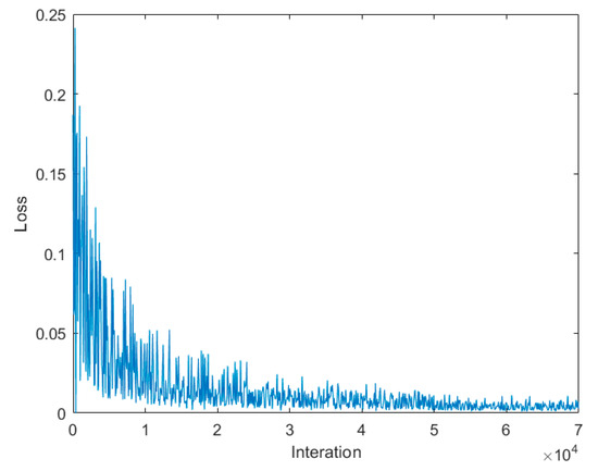 The Faster R-CNN training is carried out using the momentum method. We use a weight decay of 0.0001 and a momentum of 0.9. The learning rate is 0.001, and the number of iterations is 70,000. The training loss is plotted in Figure 6, and the total training time is approximately 2 h.