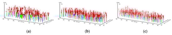 The point cloud data from the experimental plots scanned by the laser scanner were first classified as aboveground points and ground points using a cloth simulation filtering (CSF) [33] ground filtering method. The rubber tree canopy often intersected, which seriously affected the region’s growth results. Therefore, in this study, the wood-leaf separation operation [34] was performed on the aboveground points of experimental plots, which aimed to classify LiDAR points into wood and leaf components. Figure 3 shows the magnified wood-leaf separation results of several typical trees belonging to the three rubber tree clone types, where the classified leaf points are shown in green and the classified wood points are shown in crimson.