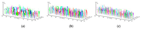 Program diagrams showing the results of the scanned trunk point detection using back projection transform from the detected tree trunk location in each deep image using Faster R-CNN, where the detected lower parts of each trunk are indicated by different colours. (a–c) show the detected results for the subset from rubber tree plot 1 (PR 107), rubber tree plot 2 (CATAS 7-20-59) and rubber tree plot 3 (CATAS 8-7-9).