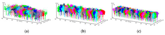 Program diagrams showing the results of the leaf point cloud clustering based on every extracted tree skeleton to complete individual tree crown segmentation, where different colours indicate the segmentation results for each rubber tree. (a–c) show the segmentation results for the subset from rubber tree plot 1 (PR 107), rubber tree plot 2 (CATAS 7-20-59) and rubber tree plot 3 (CATAS 8-7-9).