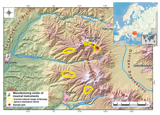The materials originate from the Gurghiu Mountains, which today are home to the largest concentration of resonance wood in the Romanian Carpathians (Figure 1). The relief and the local volcanic substratum favoured the selection and settlement of the resonance spruce phenotype [4]. The resonance spruce trees are located inside the former volcanic basin, which today forms the Gurghiu Mountains. The volcanic bowl protects the trees from excess wind circulation, thus reducing the occurrence of compression wood that compromises the acoustic value of the wood [51]. The mean annual temperature ranges around 5.2 °C at 1200 to 1300 m elevation. The soil bedrock is of andesite origin, well-supplied with rain water (850–1100 mm·year−1). The soils are deep, loose, and of moderate fertility.