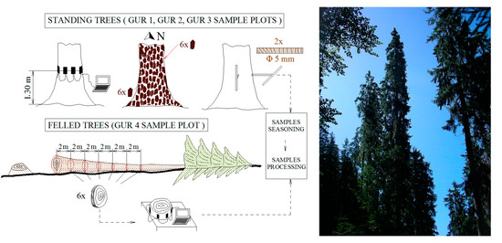 - Fedyukov, V.I.; Saldaeva, E.Y.; Chernova, M.S.; Chernov, V.Y. Biomorphology of Spruce Trees as a Diagnostic Attribute for Non-Destructive Selection of Resonant Wood in a Forest. South-East Eur. For. 2018, 9, 147–153. [Google Scholar] [CrossRef]